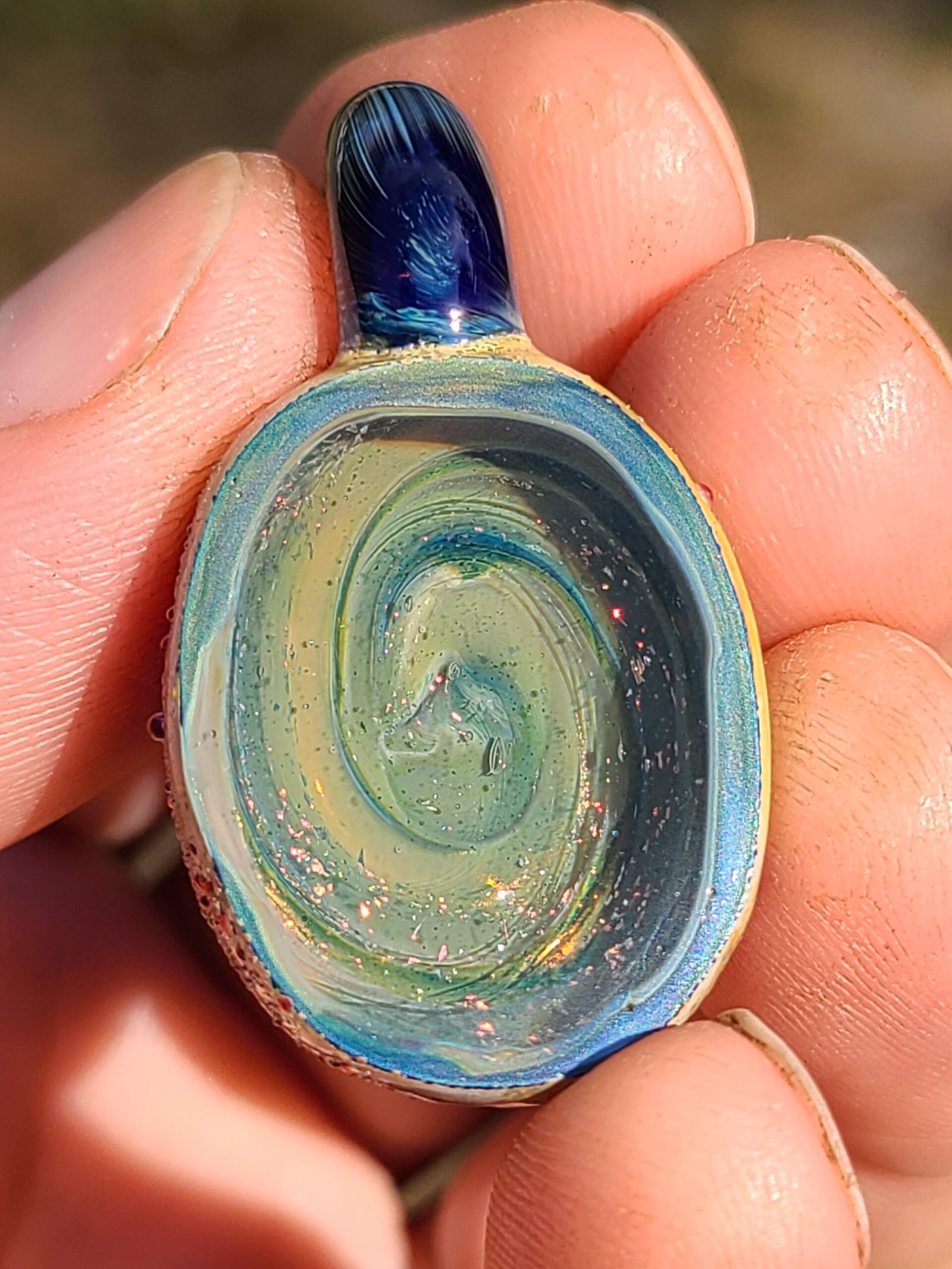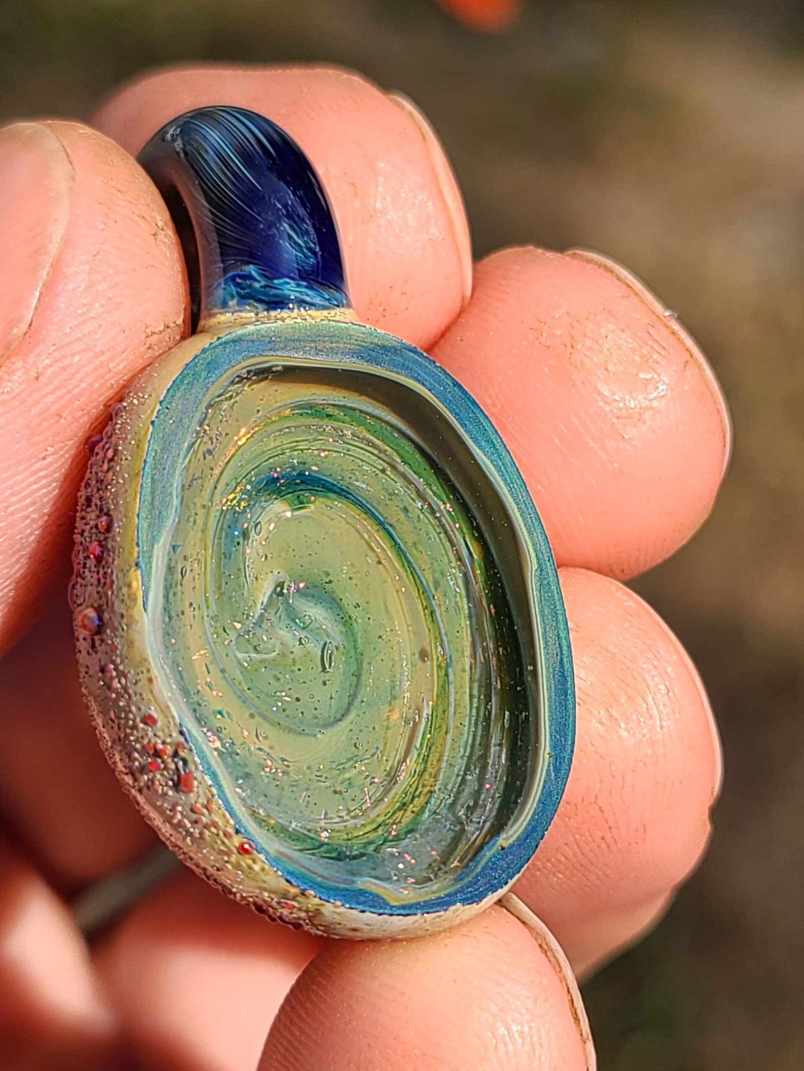 Blue vortex with dichroic Boro geode pendant.