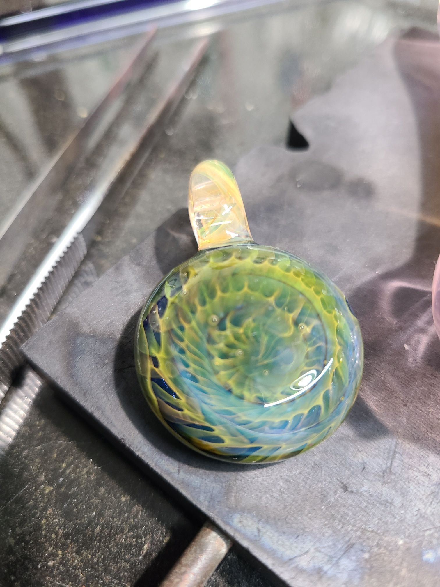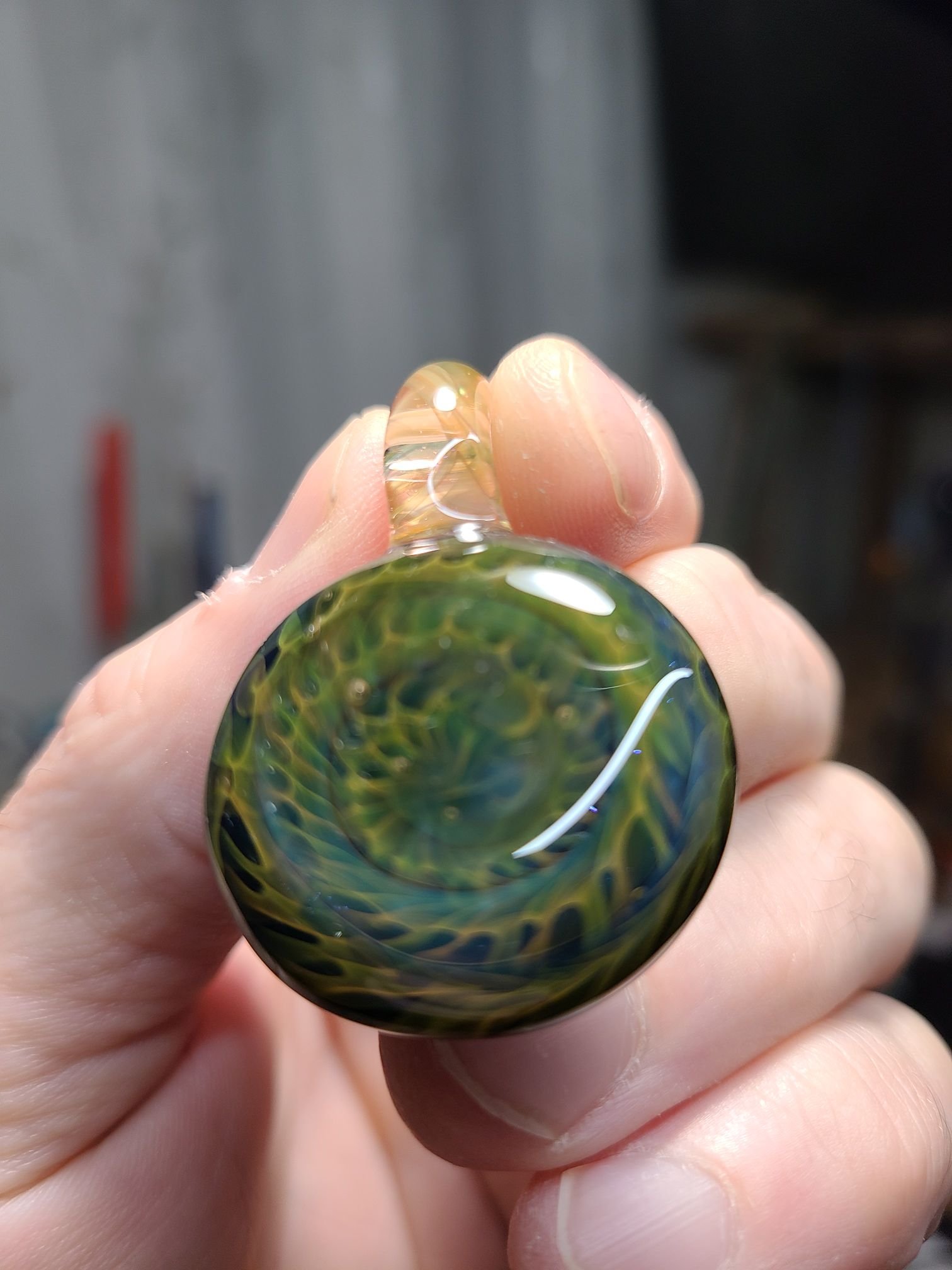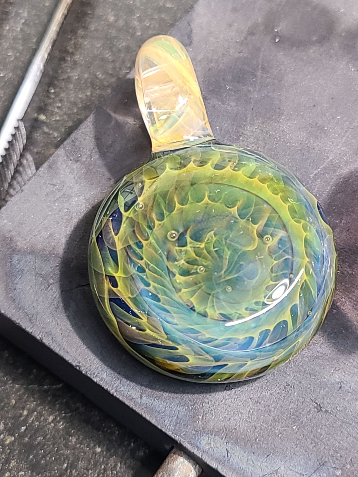 This silver and gold fumed chaos pendant almost resembles a Fibbonachi shell pattern. The color variations in this fume chaos pattern is incredibly unique. The bail is fumed cane as well.
