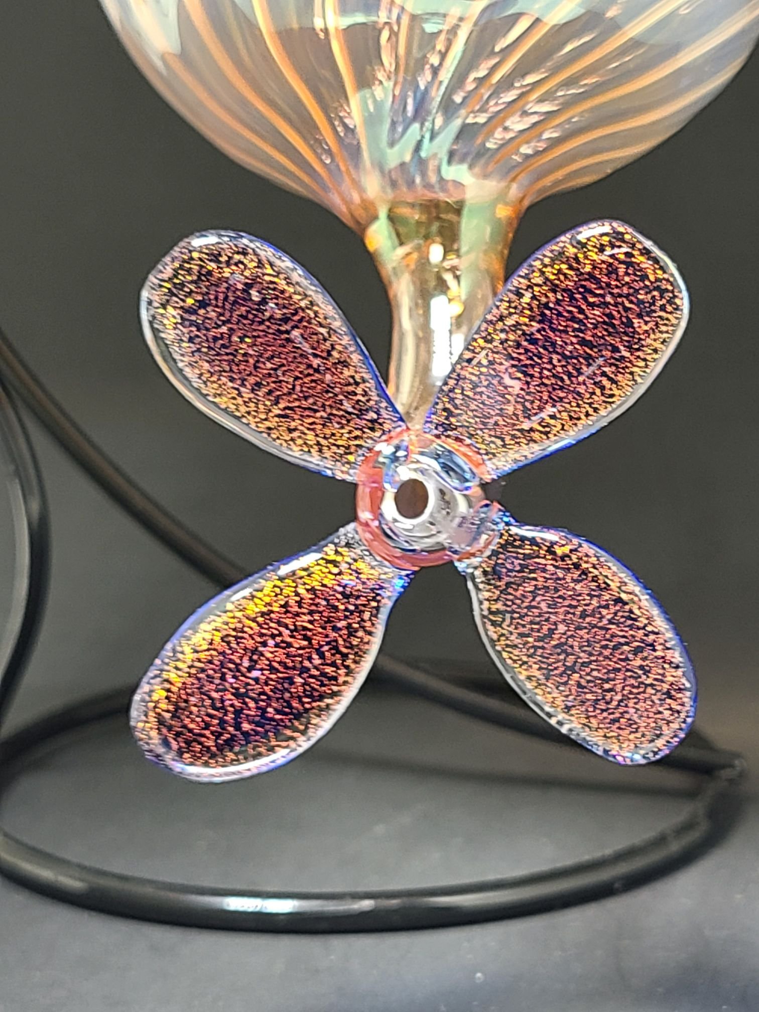 For the flower, shimmering dichroic glass petals form the feeding port, flashing vibrant iridescent tones that naturally attract hummingbirds while adding a striking visual centerpiece to any outdoor space.